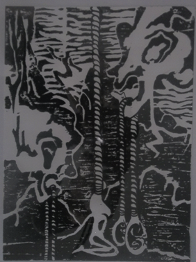 بمثل هذه المفردات والأشكال التشكيلية حاولت الفنانة التونسية "إبتسام بالكيلاني" أن تضع مقاربة جمالية لواقعها الاجتماعي وفقا لمنهج سريالي، بالنظر لنوعية الأشكال المتناولة في صورها وأعمالها والتي فيها اختارت الفنانة أشكالا موغلة في العجائبية، حيث أن "الرمز المستخدم فى الفن قد يكون استعارة أو شكلا خيالياً ذا معنى حرفي صريح أو ضمني مفهوم" ، فهي أشكال لا يوجد مرادفها في الواقع بل هي أشكال كامنة في ذهن الفنانة حولتها إلى مادة ملموسة وبسطتها أمام المتلقي ليشركها فيها وتفسح المجال أمامه لتأويلها على غرار عملها التالي الذي عرضته تحت عنوان "ظلمات"، والذي اعتمدت فيه تقنية الحفر على الخشب.